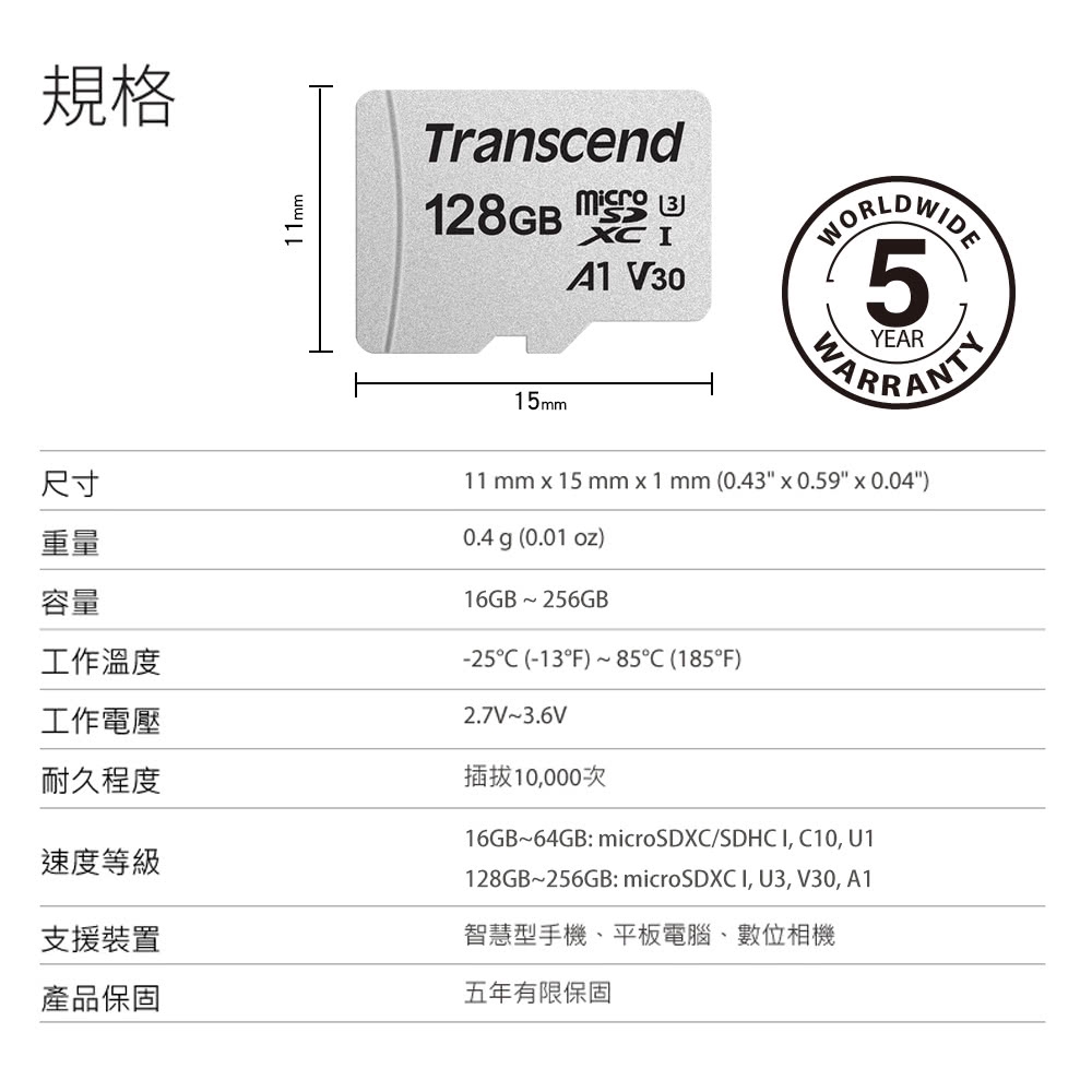 Transcend 創見 300S Micro SDXC 128G 記憶卡 UHS-I U3 A1 V30 公司貨