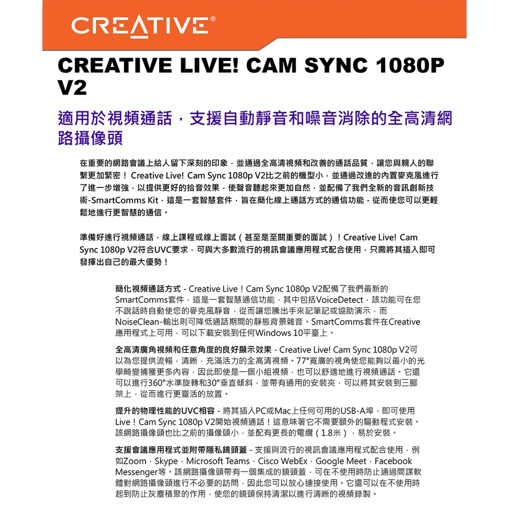 Creative Live! Cam Sync 1080p V2 降噪網絡攝影機 蝦皮直送 現貨