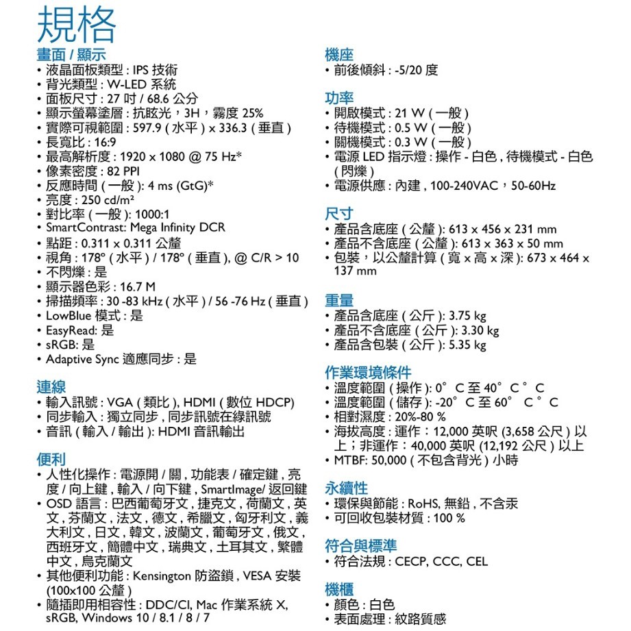 PHILIPS 飛利浦 271V8W 27型 白色 液晶螢幕 IPS面板 HDMI 現貨 廠商直送