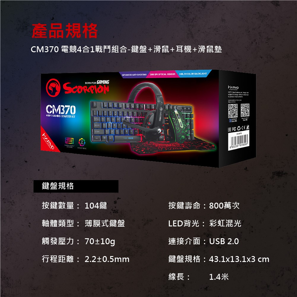 【MARVO魔蠍】CM370 電競鍵盤滑鼠組 中文注音 鍵盤滑鼠耳機滑鼠墊 RGB鍵盤組合 4段dpi 現貨 廠商直送