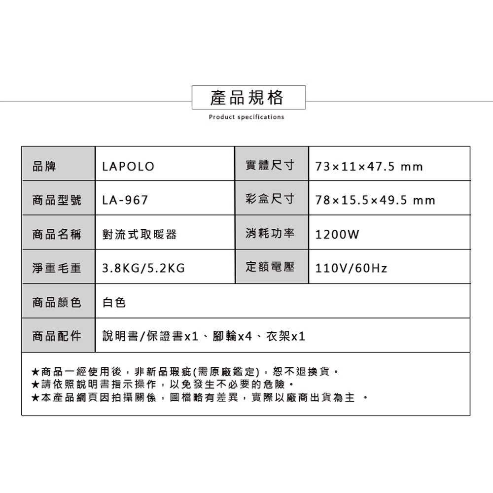 LAPOLO 防潑水 直立壁掛兩用對流式電暖器 LA-967 現貨 廠商直送