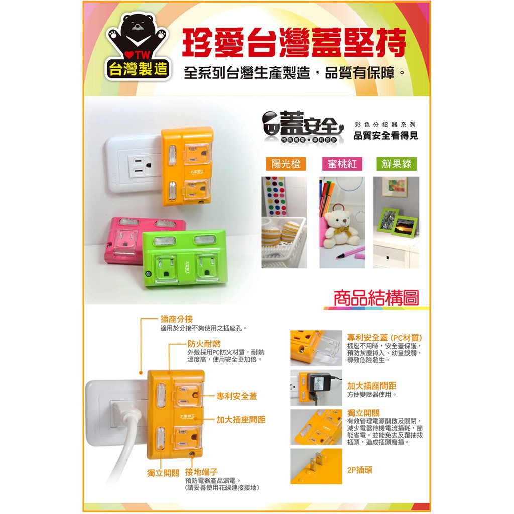 太星電工 蓋安全彩色3P二開二插分接式插座(3入)_ 現貨 廠商直送