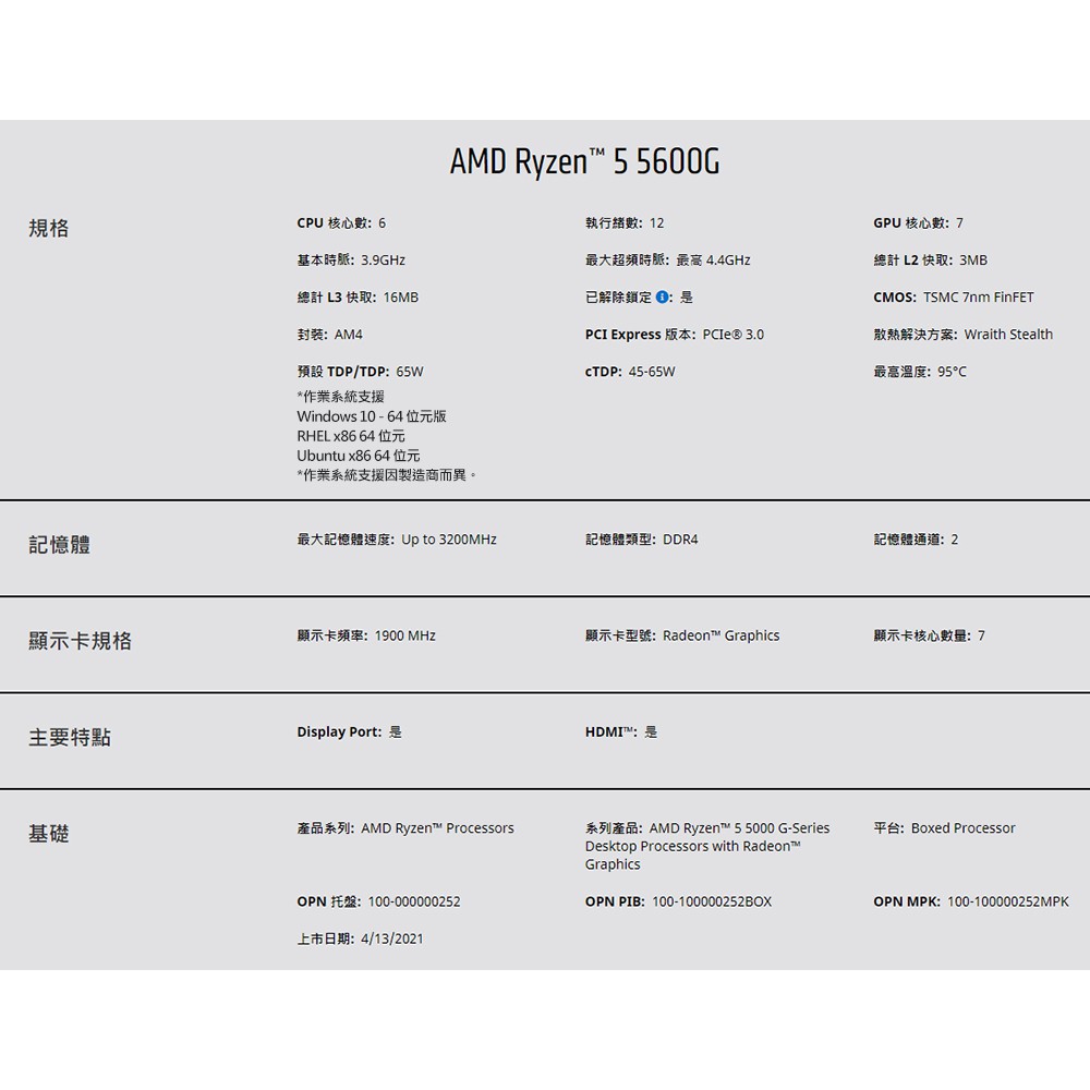 AMD Ryzen 5-5600G 3.9GHz 六核心 中央處理器 廠商直送