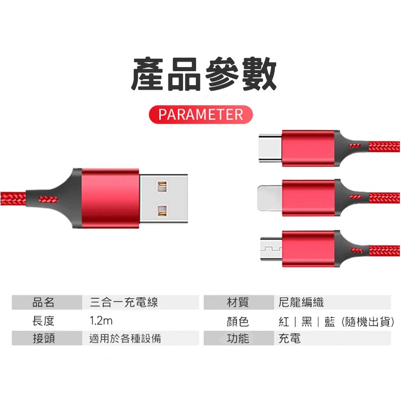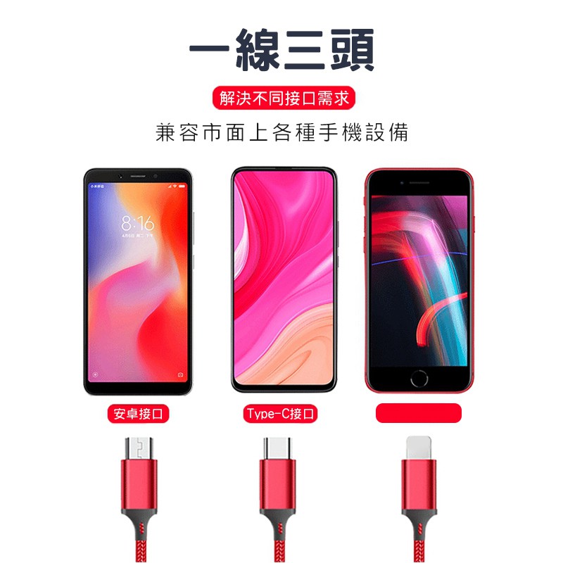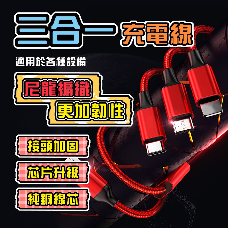 三合一充電線(三入組) 鋁合金材質 尼龍編織充電線 適用於各設備 一拖三充電線 編織線 現貨 蝦皮直送