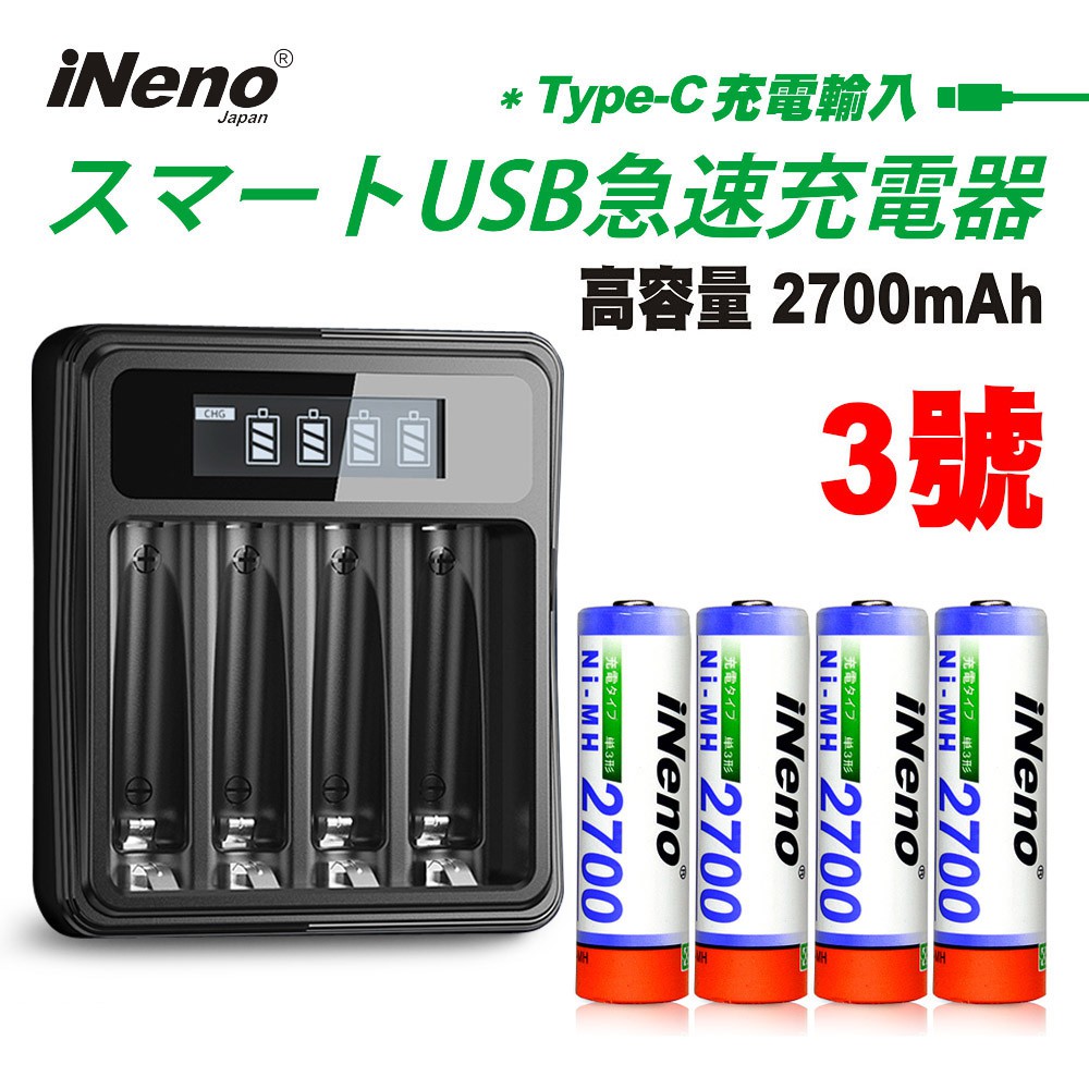 日本iNeno 3號超大容量鎳氫充電電池2700mAh+鎳氫電池液晶充電器 現貨 廠商直送