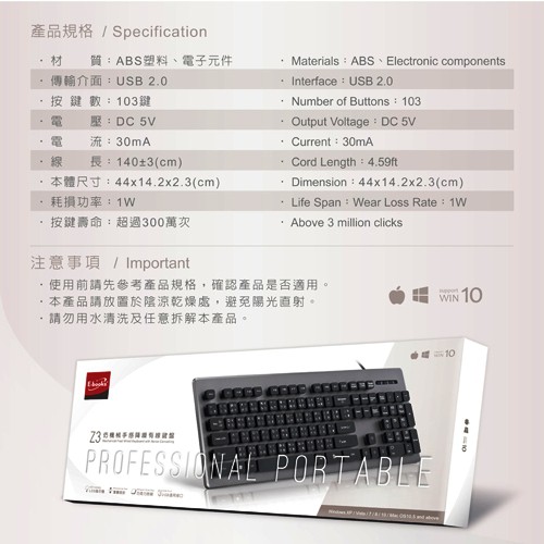 E-books Z3 USB有線鍵盤 辦公室鍵盤 標準鍵盤 仿機械手感有線鍵盤 隨插即用 銀黑 現貨 蝦皮直送