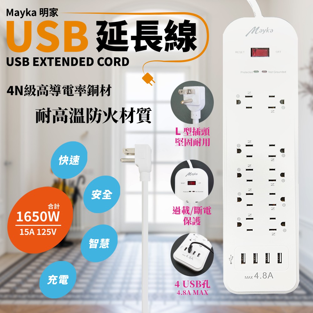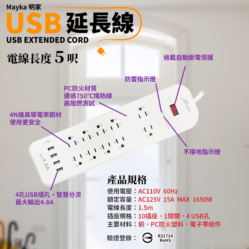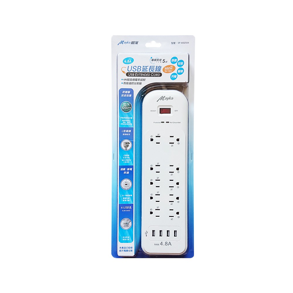 明家SP-A023U4 3孔1開10插5尺4USB防雷加大間距延長線1.5m平貼插頭4.8A大電流 現貨 廠商直送