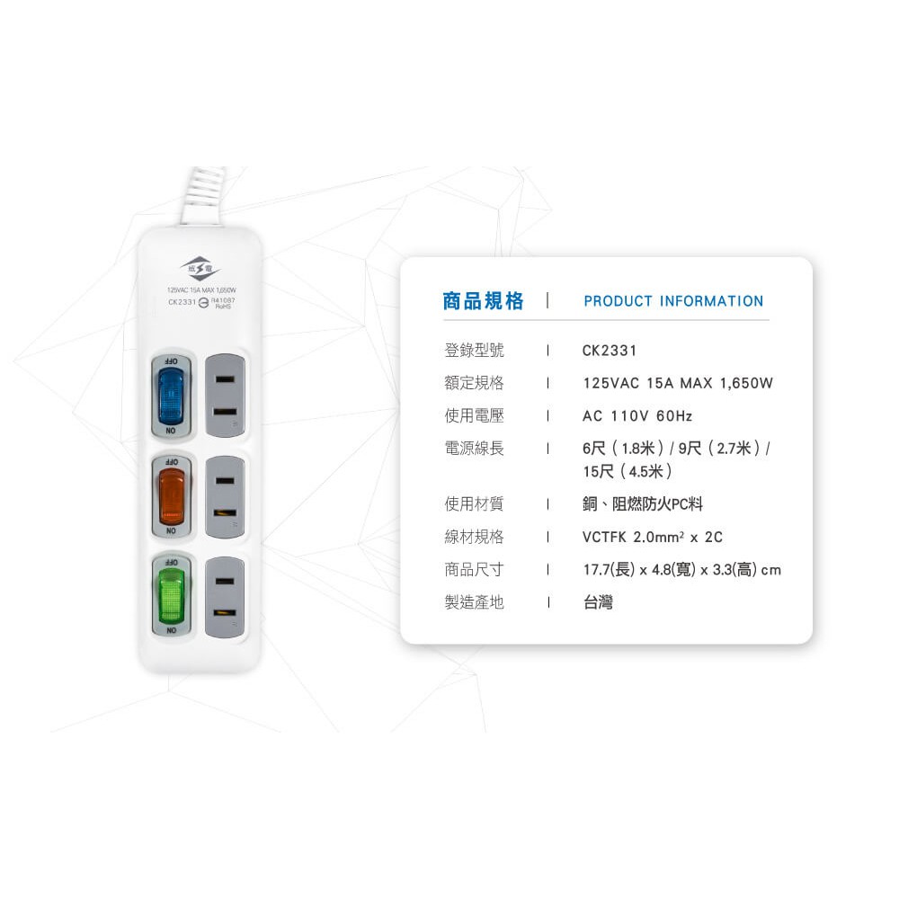 威電CK2331 3開3座電源延長線 6尺 9尺 15尺 21尺新安規認證台灣製旋轉插頭過載斷電防火材質 現貨 廠商直送