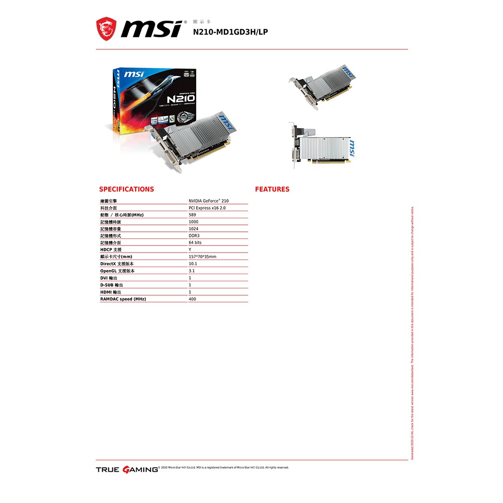 微星 N210-1GD3/LP 顯示卡 現貨 廠商直送