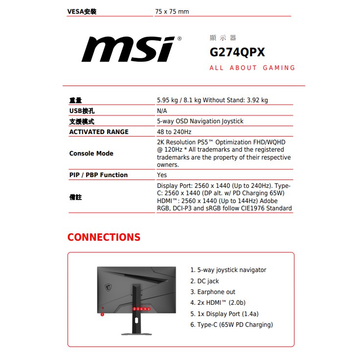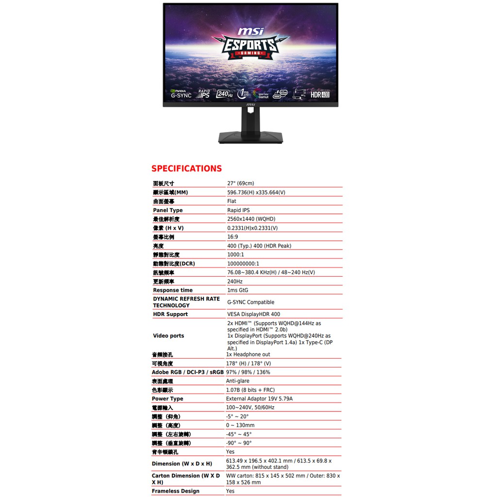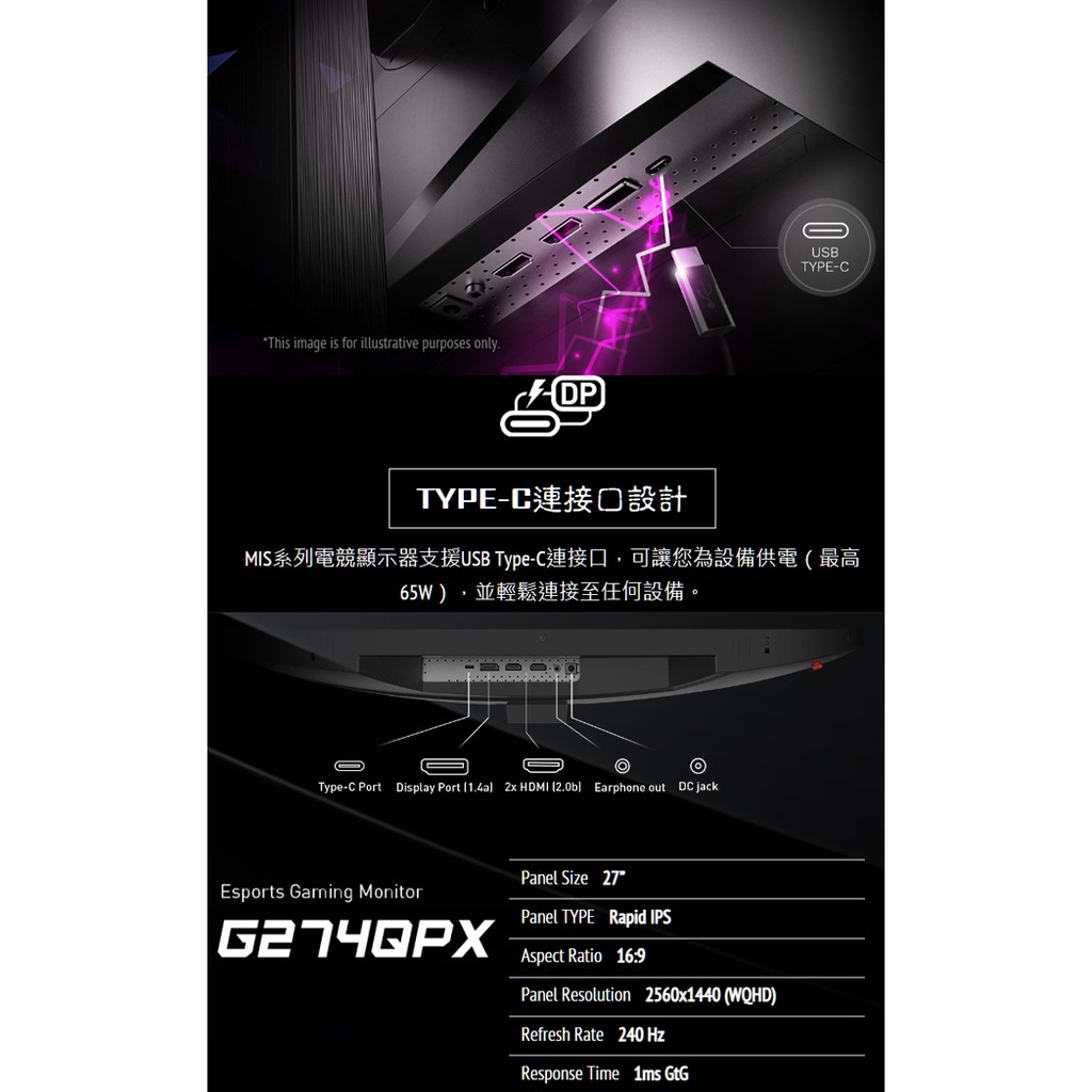 MSI 微星 G274QPX 27吋 240Hz IPS電競螢幕 現貨 廠商直送