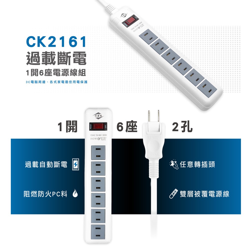 威電 CK-2161-6 2孔1開6座 延長線 6尺/1.8M(180度任轉插頭 過載斷電) 現貨 廠商直送