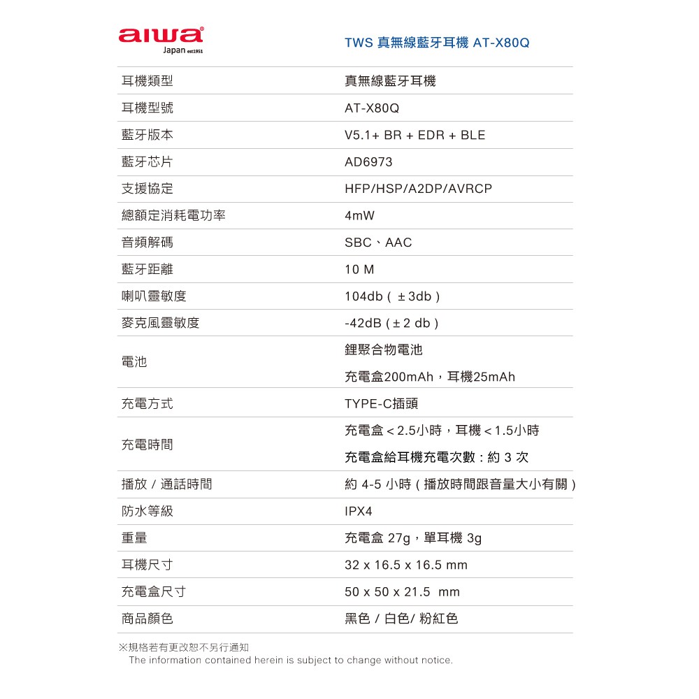 AIWA 愛華 真無線藍牙耳機 AT-X80Q 現貨 廠商直送