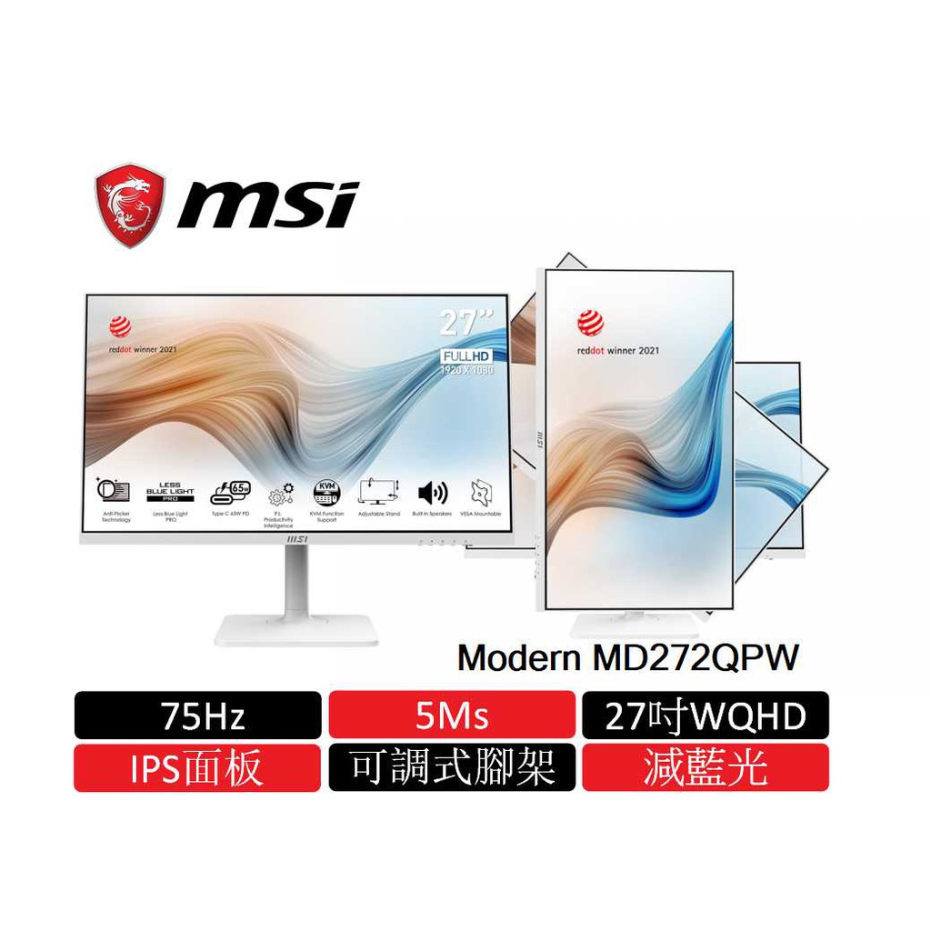 微星 MSI Modern MD272QPW 2K IPS 27吋 WQHD/75Hz/有喇叭/白色 現貨 廠商直送