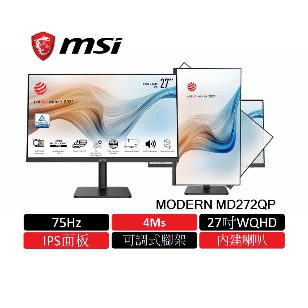 msi 微星 Modern MD272QP 2K IPS 27吋 螢幕 WQHD/75Hz/有喇叭/黑色 現貨 廠商直送