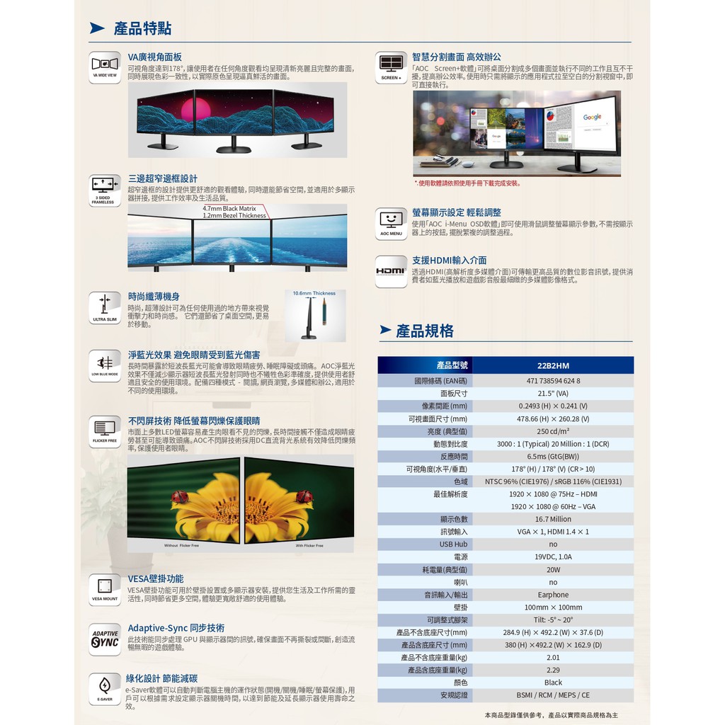 AOC 艾德蒙 22型 22B2HM 螢幕 窄邊框 廣視角 HDMI/可壁掛/無喇叭 現貨 廠商直送