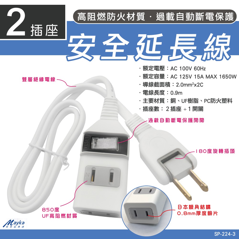 明家Mayka SP-224 2孔1開2插 延長線(180度 平貼插頭 新安規 高阻燃 過載斷電 電源 現貨 廠商直送