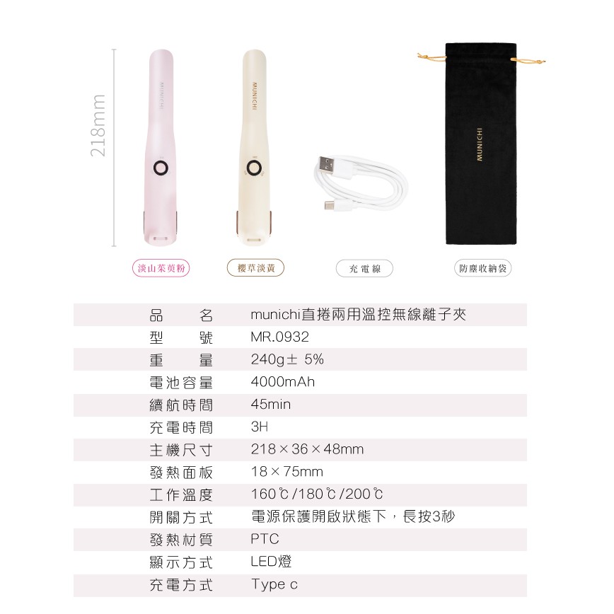 MUNICHI 沐尼黑 直捲兩用溫控離子夾 無線迷你離子夾 USB充電 MR.0932 現貨 廠商直送