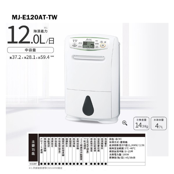 【MITSUBISHI三菱】 12L 輕巧高效型一級節能 除濕機MJ-E120AT-TW 廠商直送