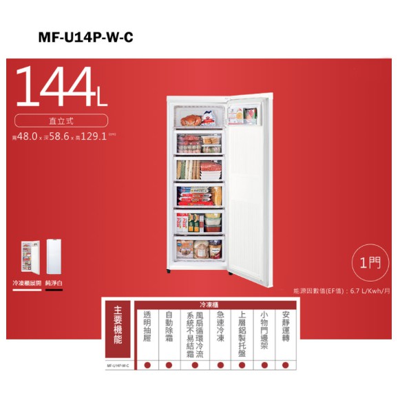 【MITSUBISHI三菱】 144L單門直立式冷凍櫃 MF-U14P-W-C 大型配送