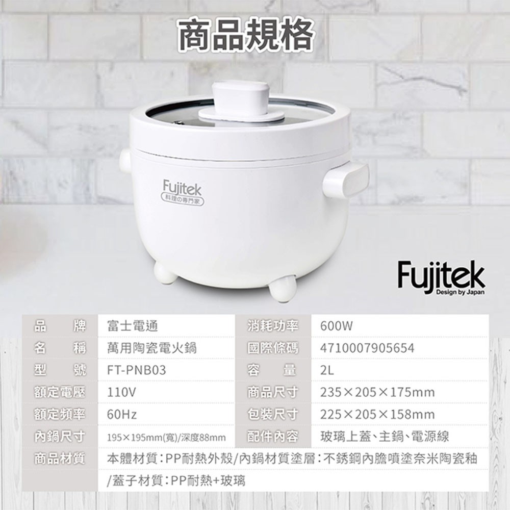 Fujitek富士電通 2L萬用陶瓷電火鍋 FT-PNB03 現貨 廠商直送