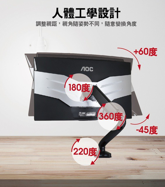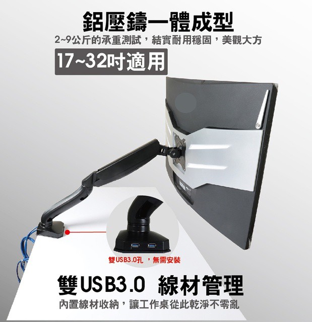 內建USB3.0 氣壓式螢幕支架 17-32吋液晶 液晶架 人體工學螢幕支架 (夾鎖桌2用) 廠商直送現貨