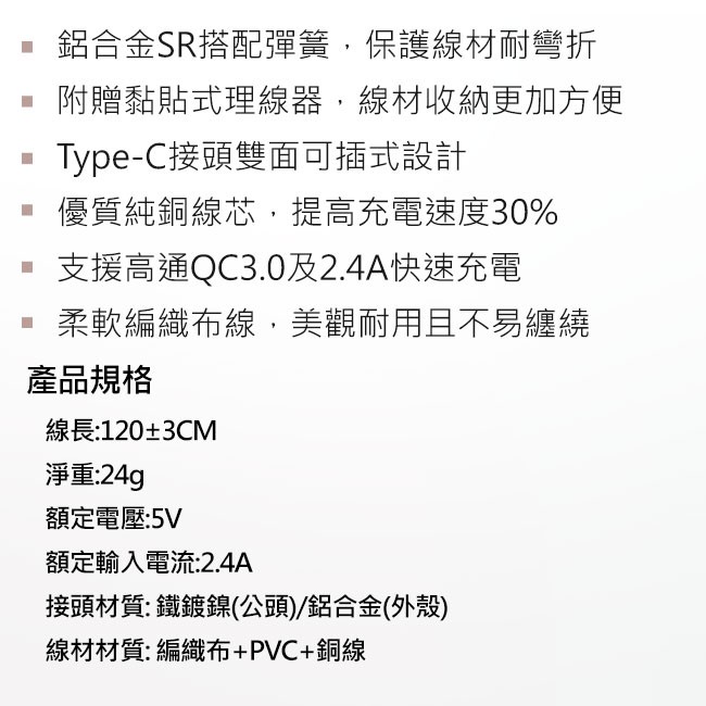 INTOPIC Type-C 快充 QC3.0 鋁合金耐彎折 充電線 傳輸線 120cm 蝦皮直送