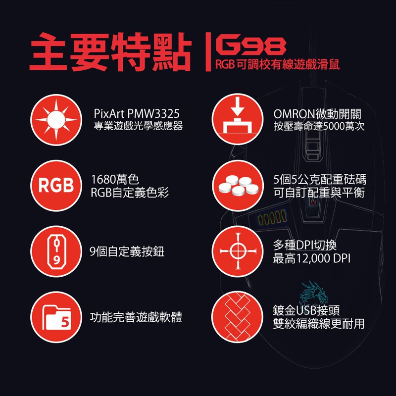 LEXMA G98 RGB可調校有線遊戲滑鼠 黑 現貨 廠商直送 宅配免運