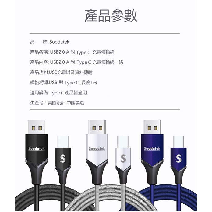 Soodatek Type C to A 充電線/傳輸線 高彈絲編織充電傳輸線-2M 現貨 蝦皮直送