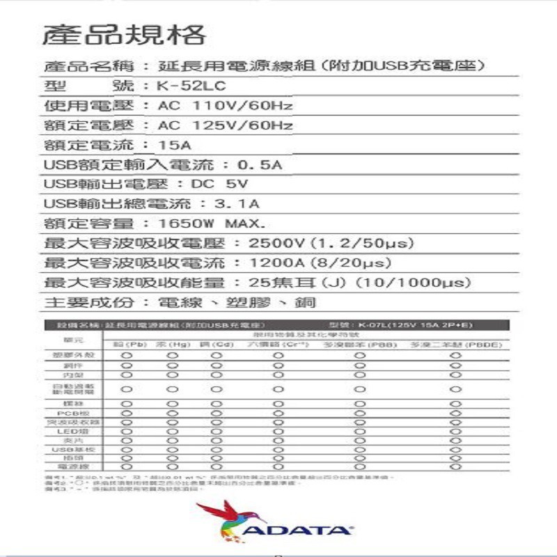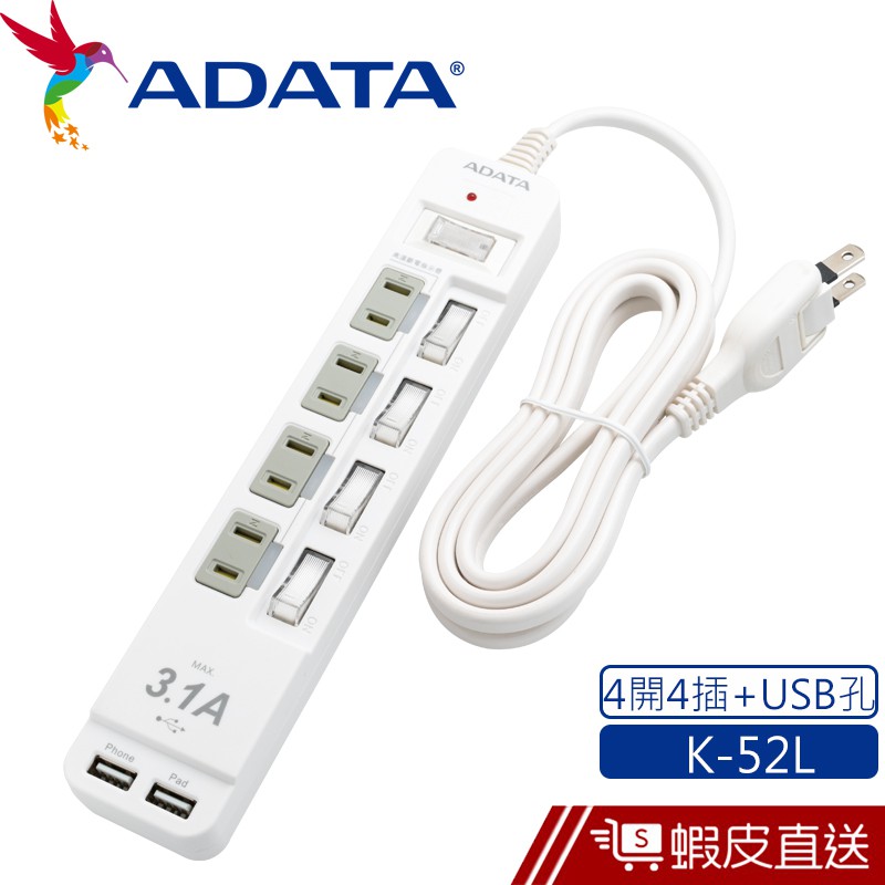 ADATA 威剛 5切4座2孔+2USB延長線 K-52L 現貨 蝦皮直送