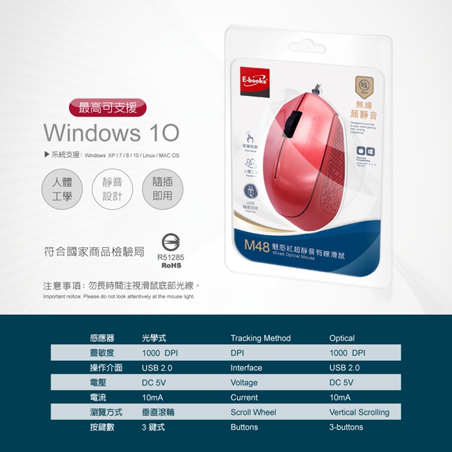 E-books M48 魅惑紅超靜音有線滑鼠 現貨 蝦皮直送