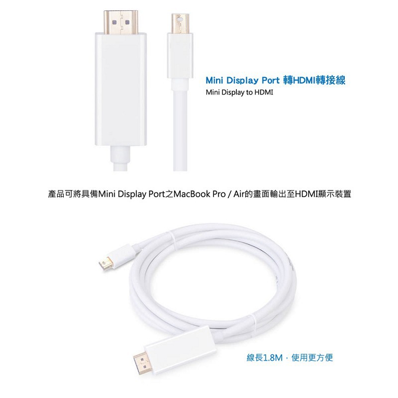 Mini Display Port 轉HDMI轉接線(白色-1.8M) 現貨 廠商直送
