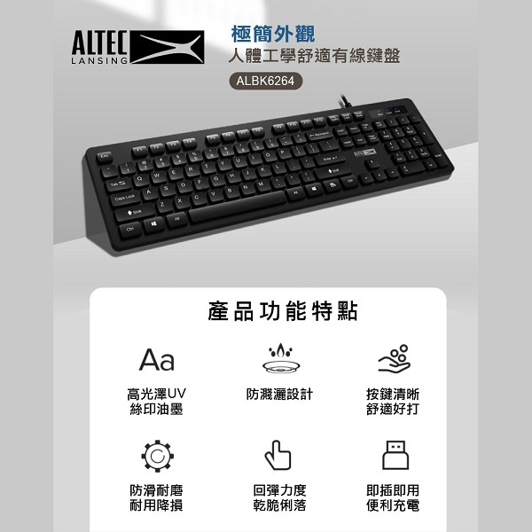 ALTEC LANSING 人體工學 舒適 有線鍵盤 辦公 可調式支架 隨插即用 ALBK6264 現貨 廠商直送