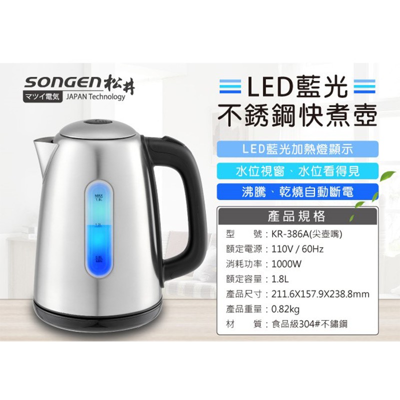 SONGEN松井 LED藍光不銹鋼快煮壺/電水壺(KR-386A尖壺嘴) 現貨 廠商直送