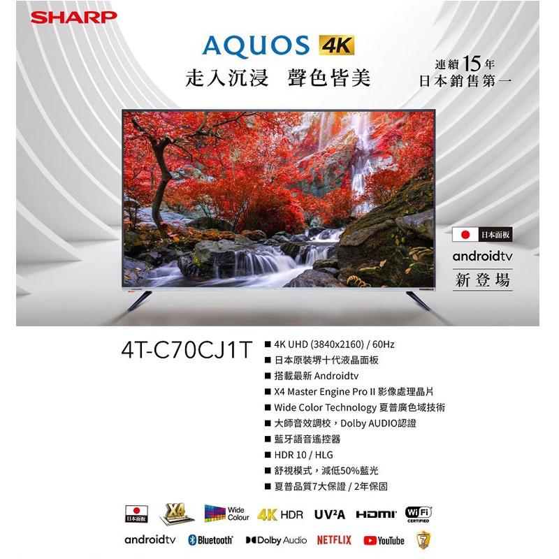 SHARP夏普 70吋4K Android連網液晶顯示器+視訊盒(C70CJ1T) 大型配送