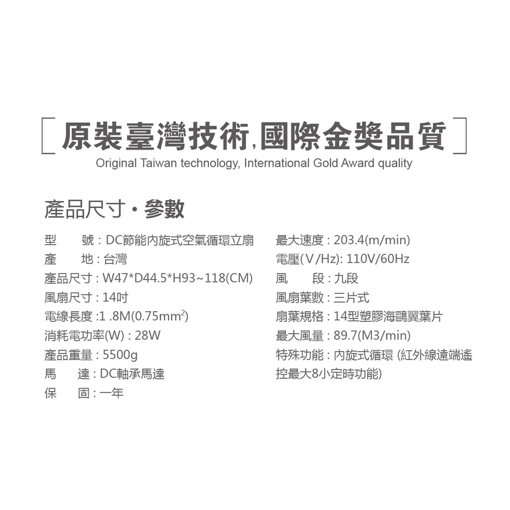 中央牌 KDS-141SR(白色) 14吋DC節能內旋式遙控型9段式循環立扇-厚底旗艦款-塑膠葉片 廠商直送