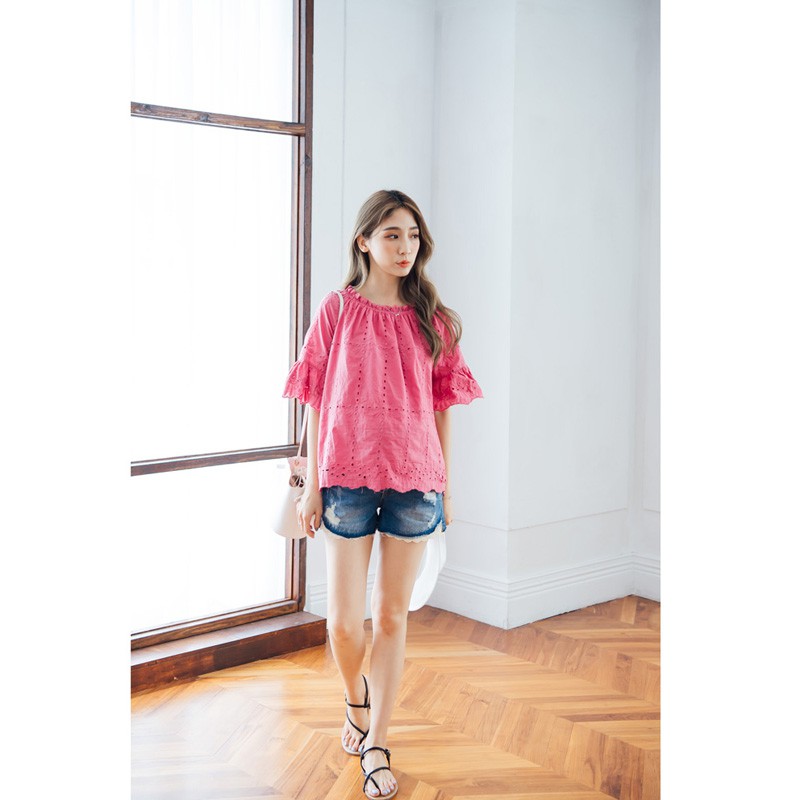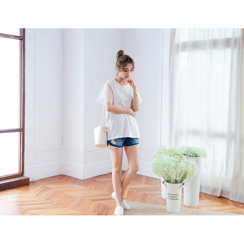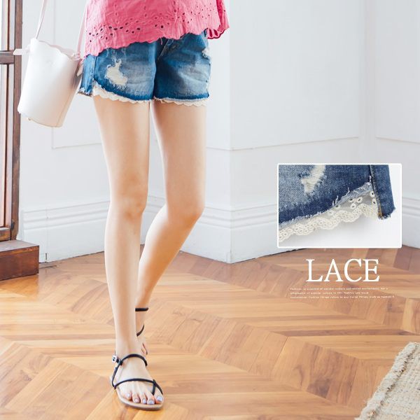 腰可調孕婦褲 蕾絲刷破抽鬚牛仔短褲【HB3452】