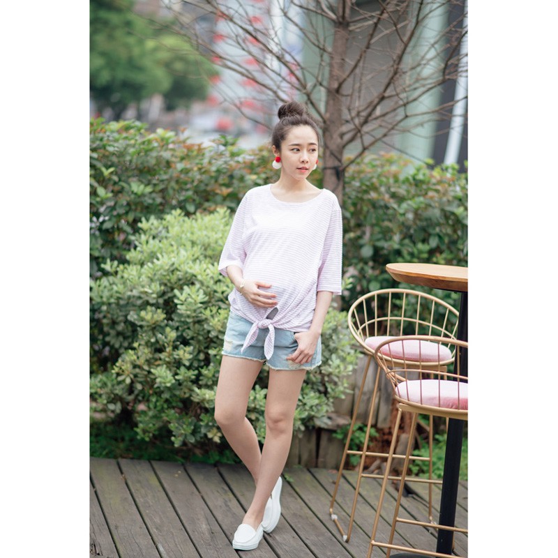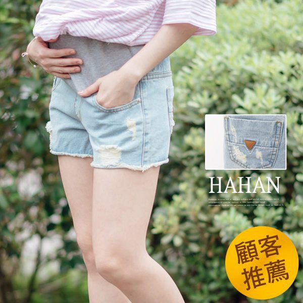 哈韓孕媽咪孕婦裝 腰可調 三角皮革口袋下抓鬚牛仔短褲【HB3432】