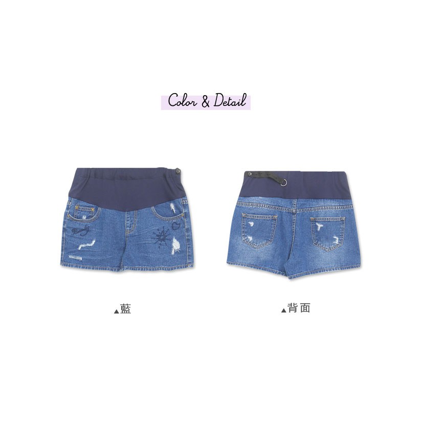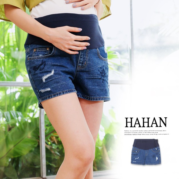 腰可調 圖案刺繡刷破牛仔短褲【HB3656】哈韓孕媽咪孕婦裝