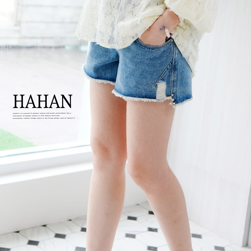 腰可調 經典刷色抽鬚牛仔短褲 哈韓孕媽咪孕婦裝【HB3813】