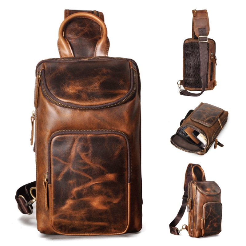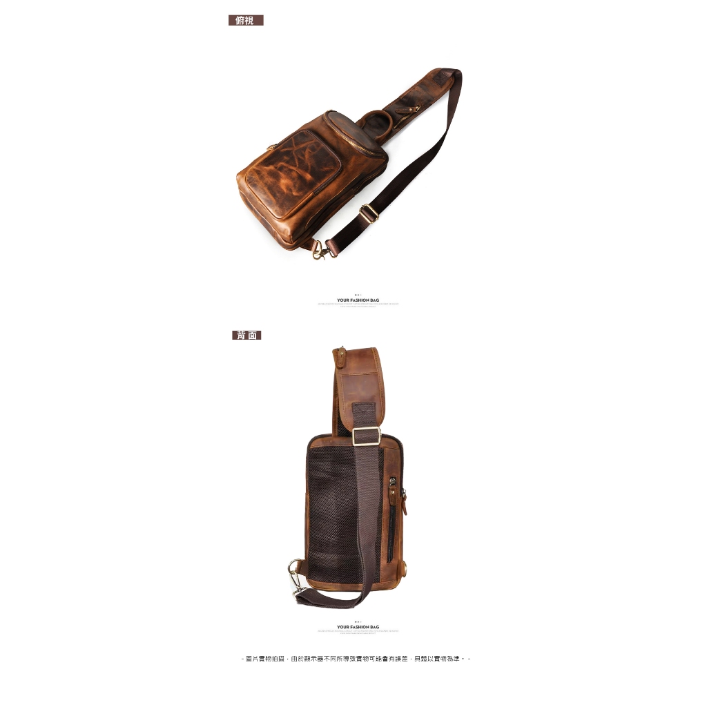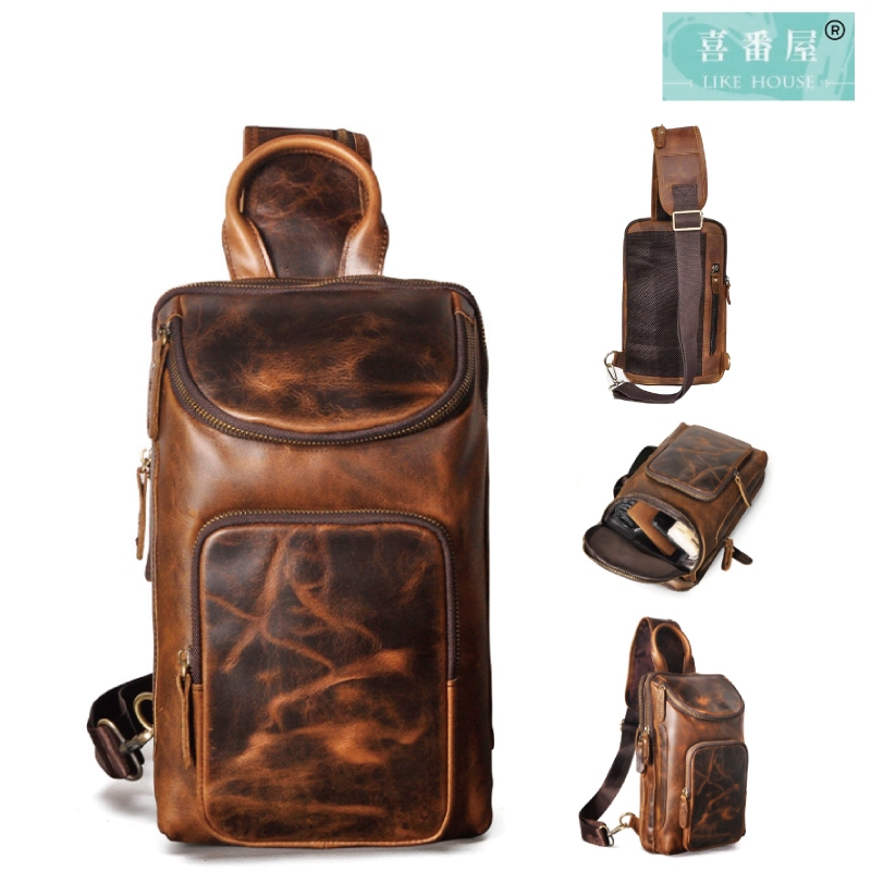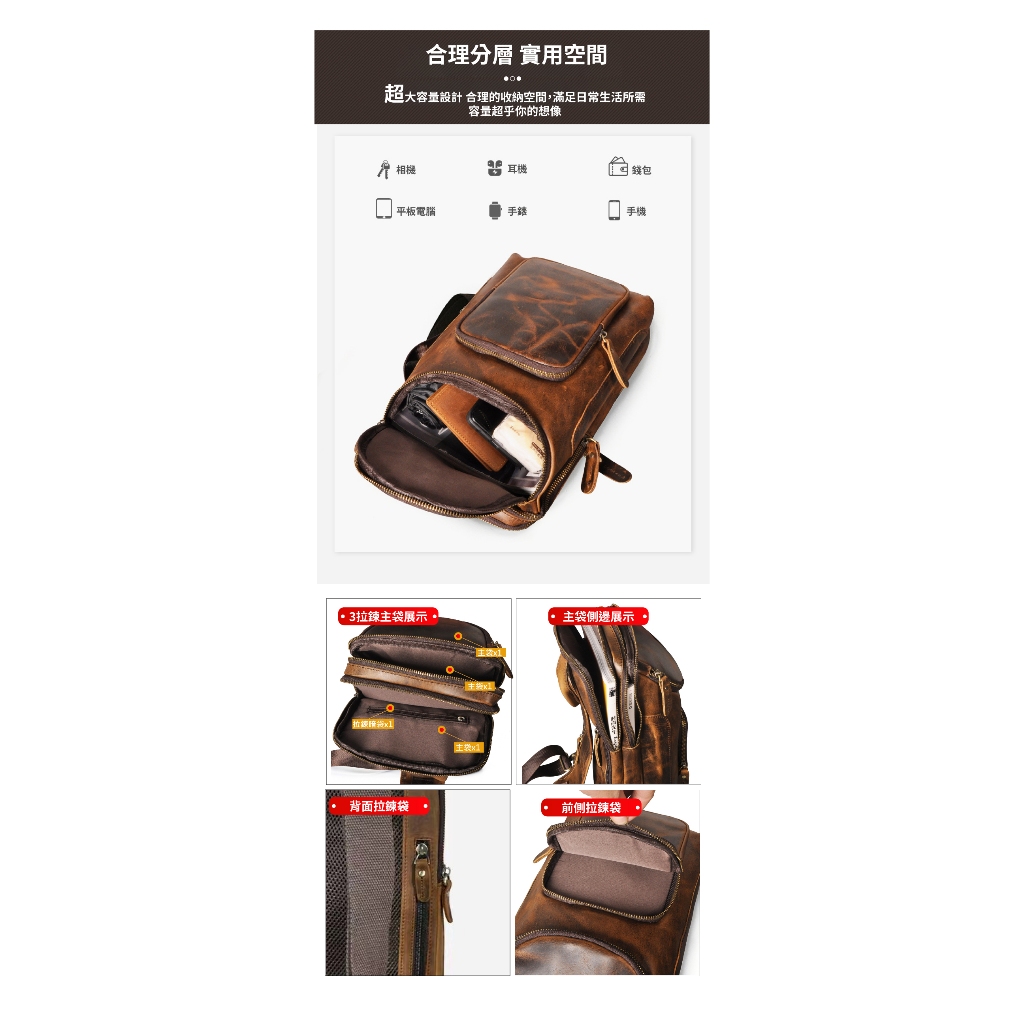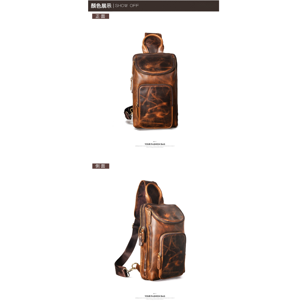 【喜番屋】真皮頭層瘋馬牛皮男士三拉鍊肩背包胸包男包【LB1018】