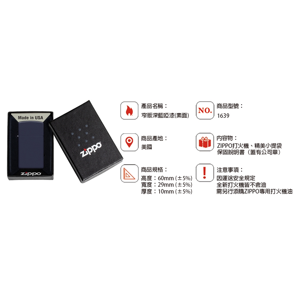 [隔日到貨] ZIPPO 經典素面防風打火機 窄版深藍啞漆 素面 1639 黃銅 美國製 煤油打火機