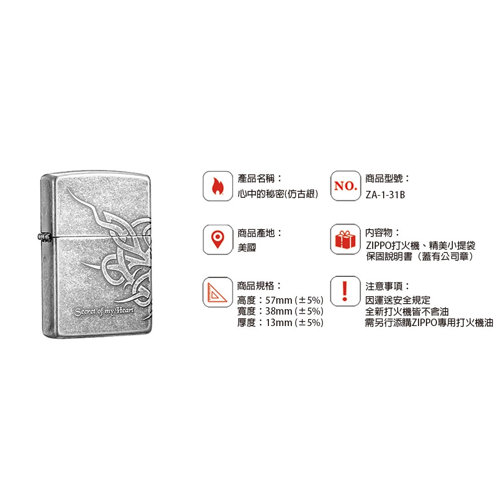 [隔日到貨] ZIPPO 亞洲限定防風打火機 心中的秘密 仿古銀 ZA-1-31B 黃銅 美國製 煤油打火機