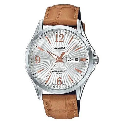 【CASIO】卡西歐 六芒星璀璨閃耀精緻皮帶紳士錶白X玫瑰金X棕色錶帶 MTP-E120LY-7A 台灣卡西歐保固一年