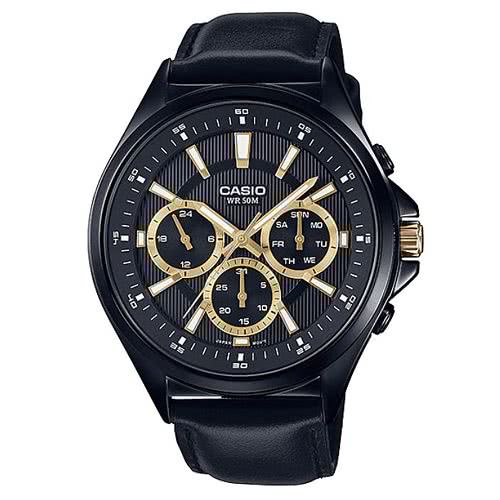 【CASIO】卡西歐 埃及風密編織錶帶皮帶紳士錶-黑X金 MTP-E303BL-1A 台灣卡西歐保固一年