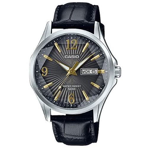 【CASIO】卡西歐 六芒星璀璨閃耀精緻皮帶紳士錶-黑X金 MTP-E120LY-1A 台灣卡西歐保固一年