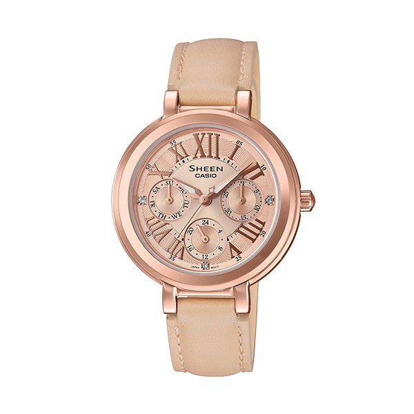 【CASIO】卡西歐 SHEEN系列 皮帶三眼女錶 SHE-3034GL-9A 防水50米 台灣卡西歐保固一年