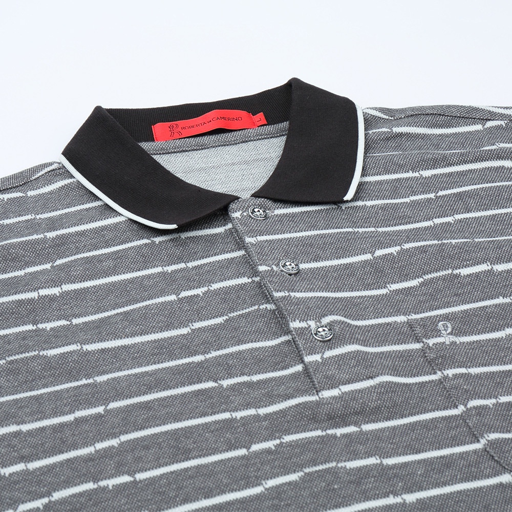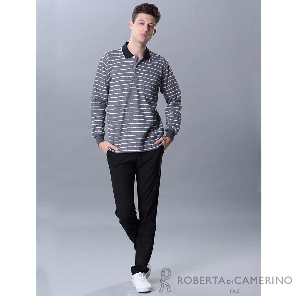 ROBERTA諾貝達 台灣製 特色條紋長袖POLO棉衫 灰黑