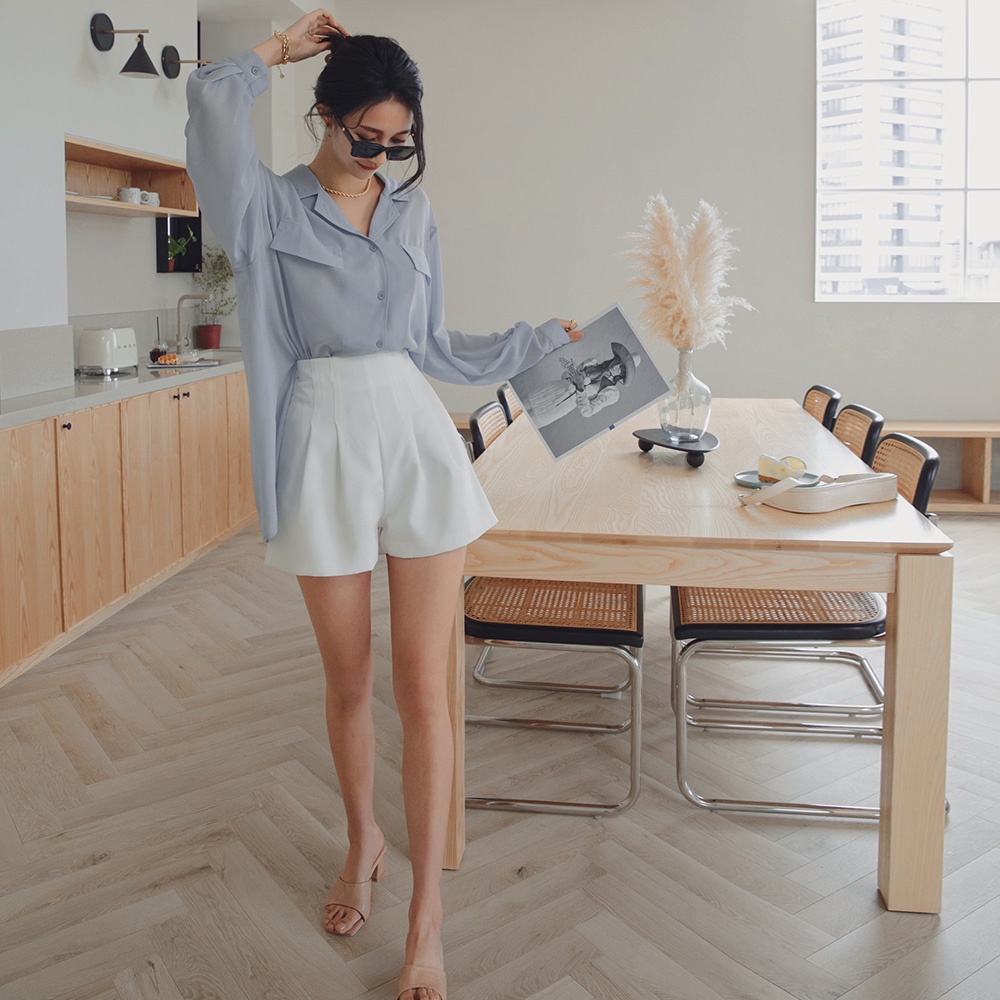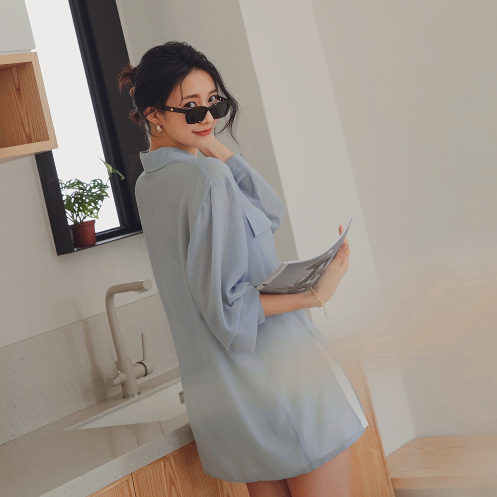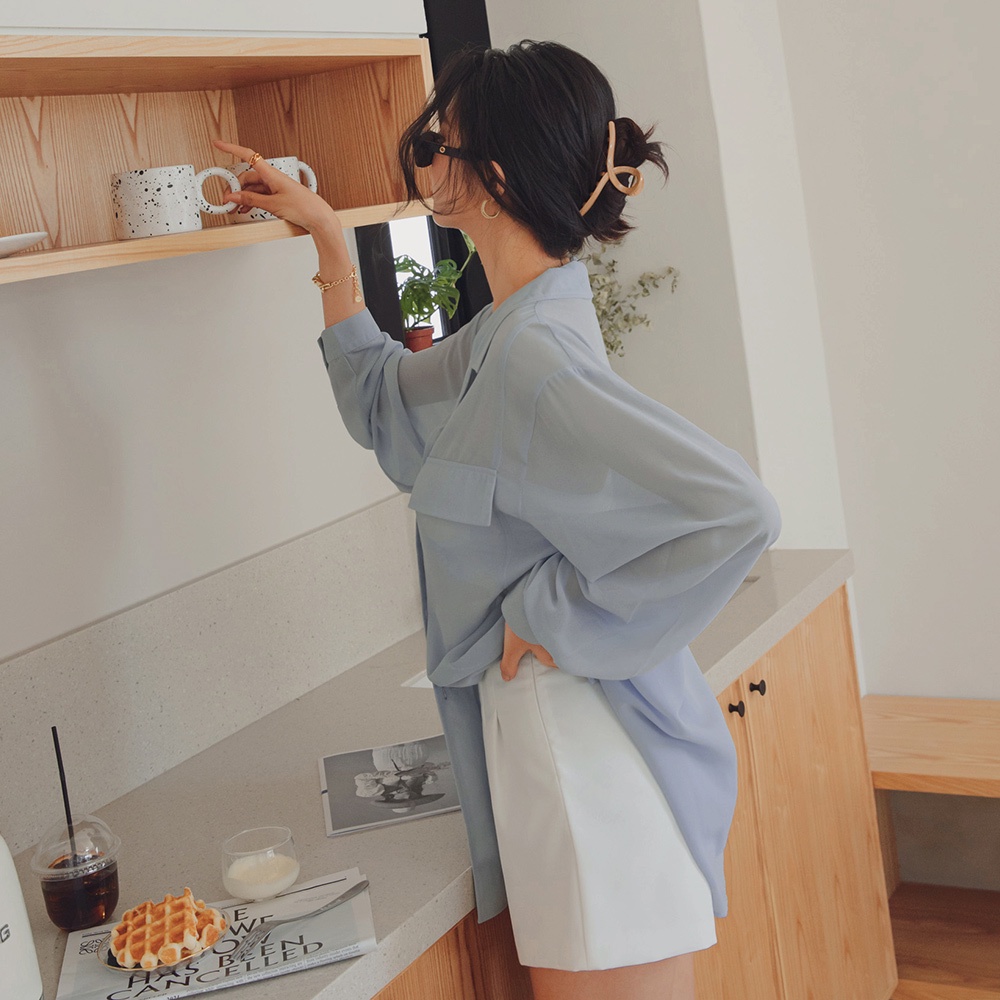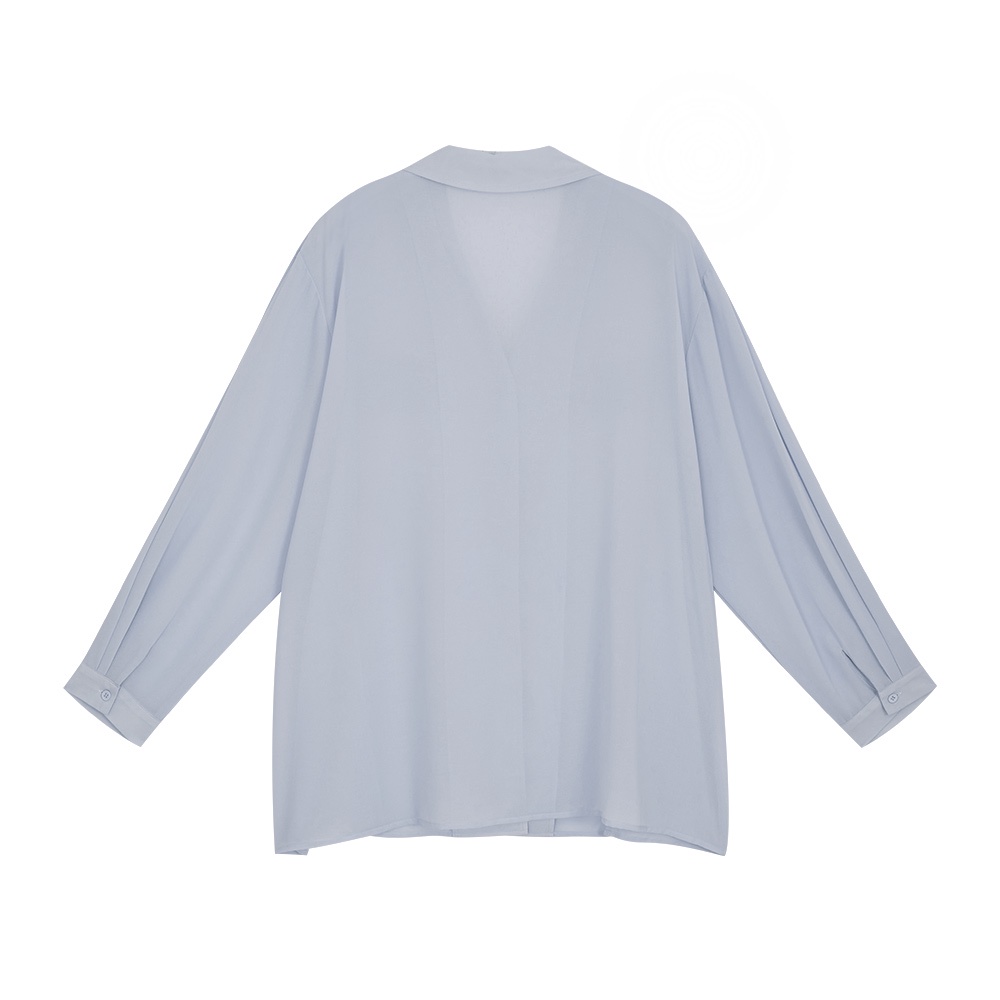 AIR SPACE LADY 透紗側衩長袖襯衫(藍灰)