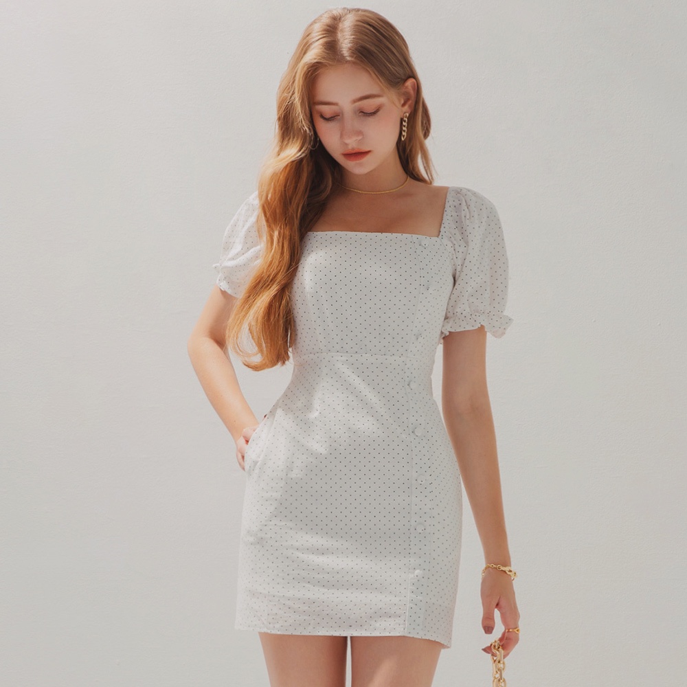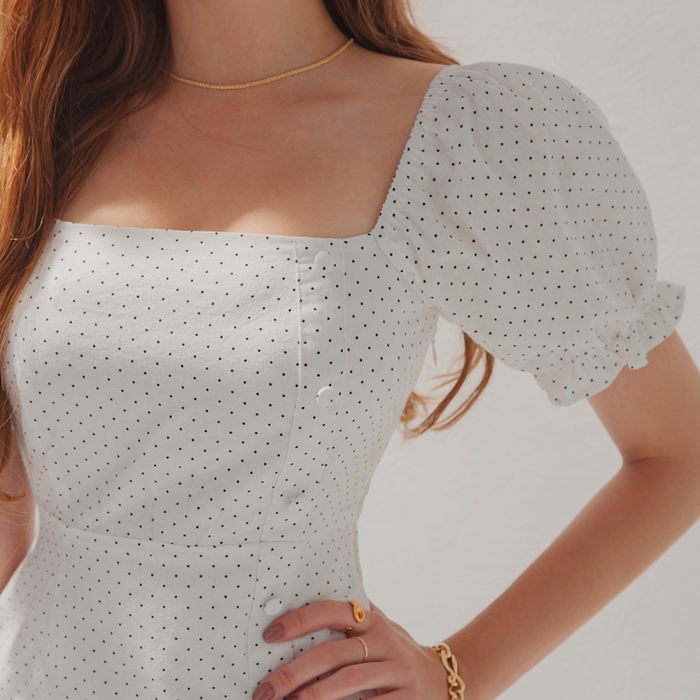 AIR SPACE 美式點點方領澎袖短洋裝(白底黑點)