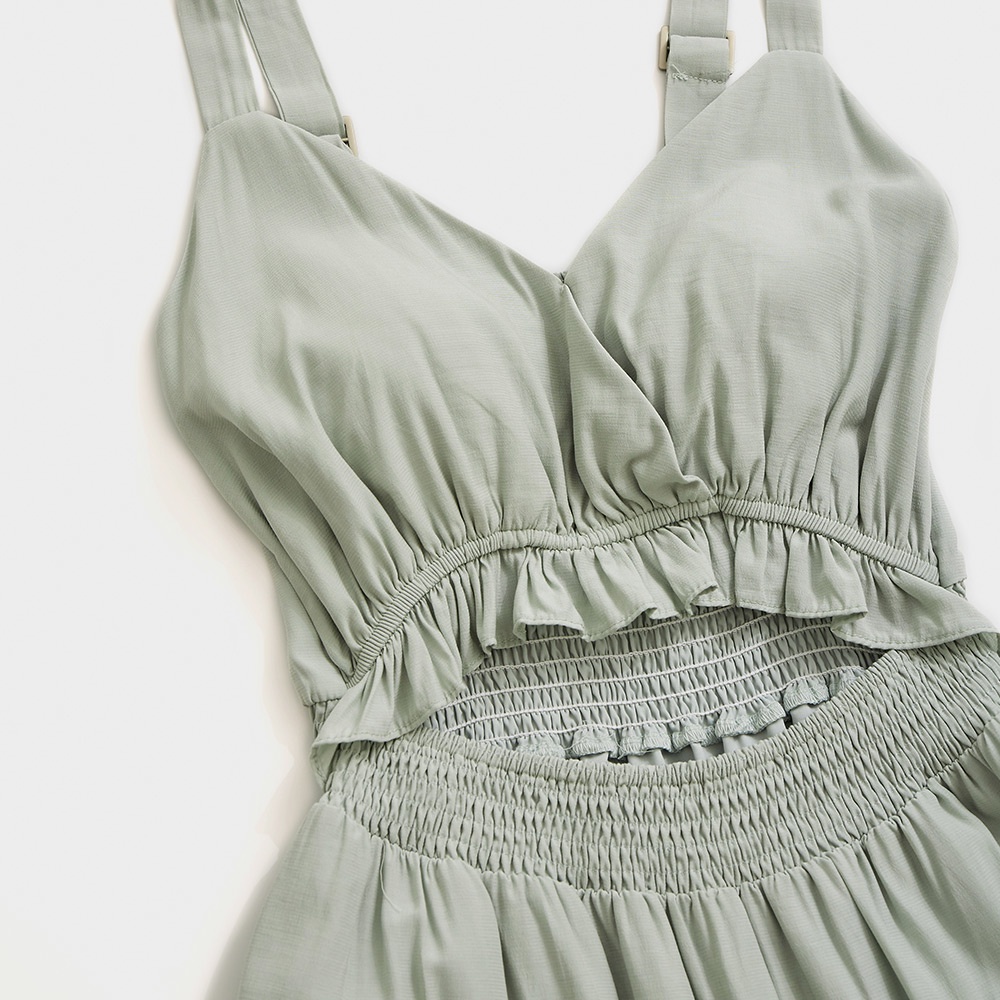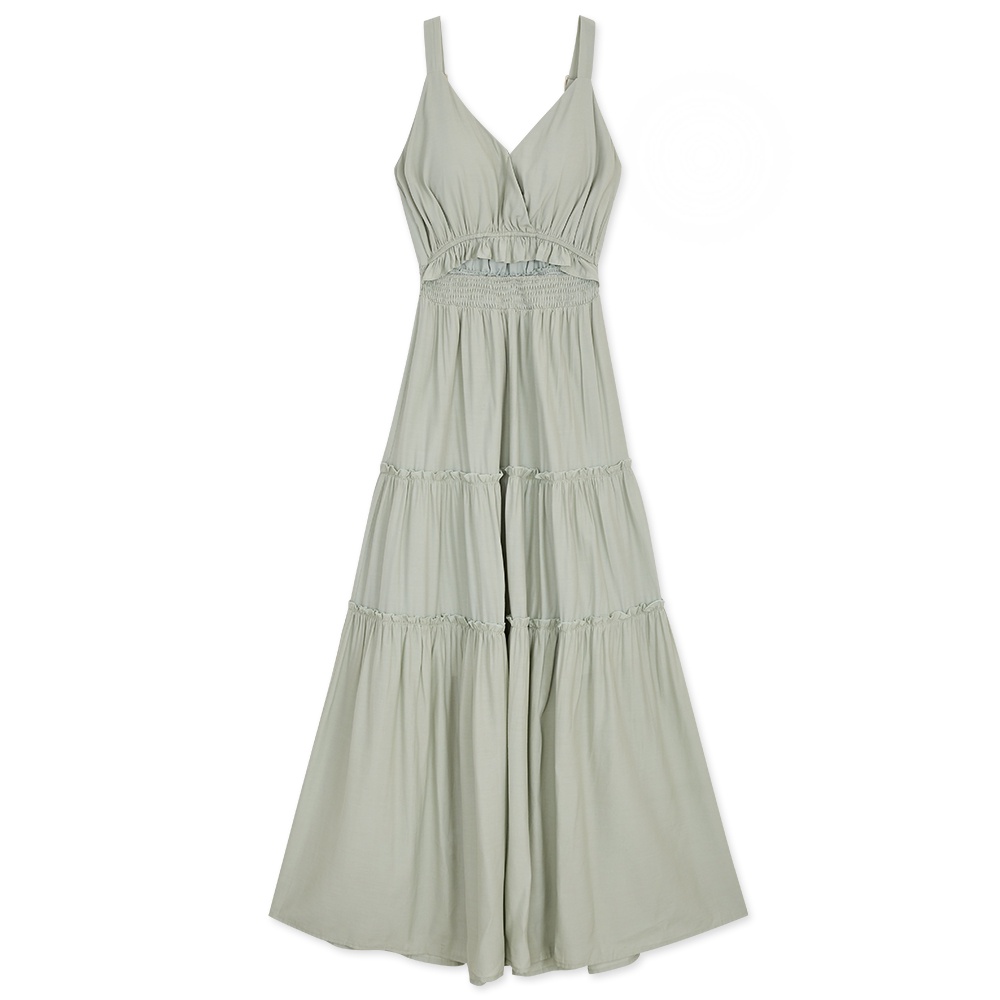 AIR SPACE 渡假感腰鏤空荷葉長洋裝(附胸墊)(綠)